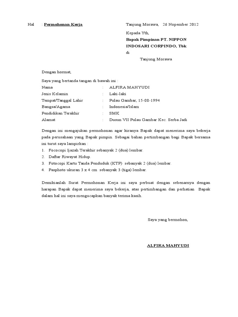 Surat Lamaran from imgv2-2-f.scribdassets.com Contoh surat lamaran kerja terbaik, lengkap beserta tips dan trik rahasia pembuatan surat lamaran kerja sehingga mudah mendapatkan pekerjaan. Untuk anda yang ingin mendaftar pekerjaan di toko swalayan, berikut format yang. Sebagai contoh surat lamaran kerja, hal pertama yang ada dalam lampiran surat adalah adanya nama kota dan tanggal pembuatan surat.