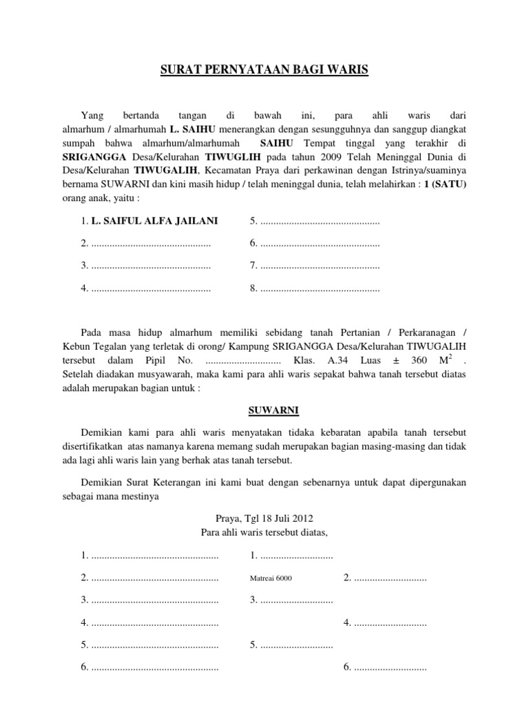 Download contoh surat pernyataan ahli waris tanah. Bagaimana cara membuat surat kuasa ahli waris tanah atau rumah untuk melengkapi dokumen saat proses jual beli warisan? Contoh surat pernyataan ahli waris tanah gawe cv.