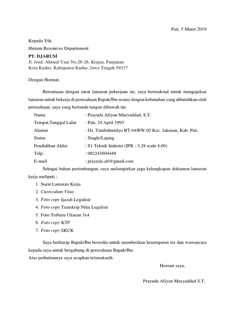 Referensi contoh surat lamaran kerja di pabrik rokok gudang garam